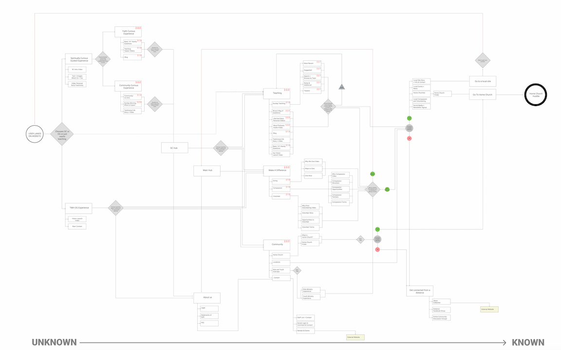 During this stage I was also focusing my efforts on audience research that would inform our user flows, site map, and navigation. I was able to connect with a dozen users who identified as spiritually curious, across a wide range of segments, as well as a few staff and church members, and used OptimalSort to carry out UX research, including:
